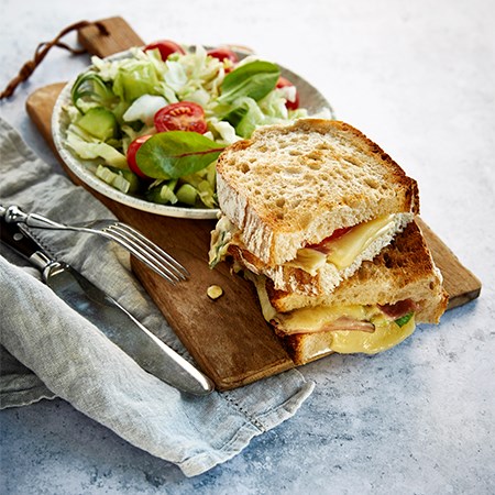 Muhkea Grand Blanc toast kinkku-juusto täytteellä ja vihreä salaatti.